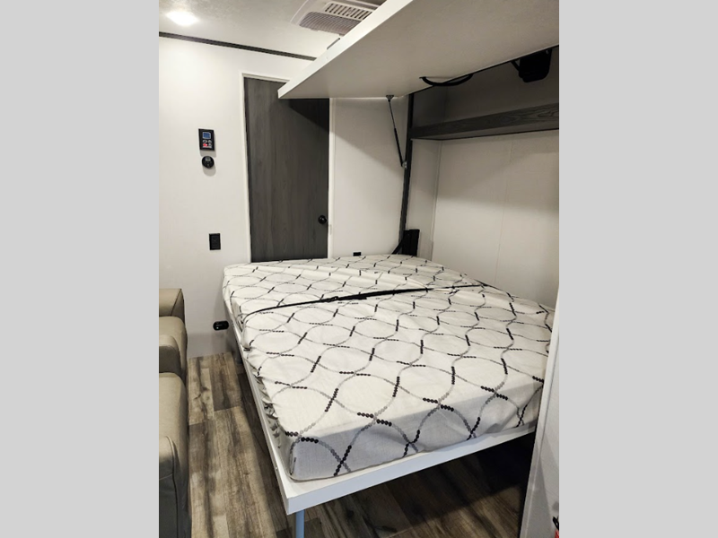 Each model is built with a heated and enclosed underbelly and smooth front metal for added protection against the elements. There is also a 100-watt solar panel outside, along with a power awning with LED lights and fender skirts. You'll love the 6' 10" height inside, along with pleated night shades and seamless thermofoil countertops in the kitchen.