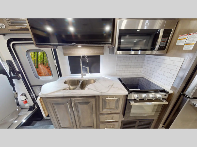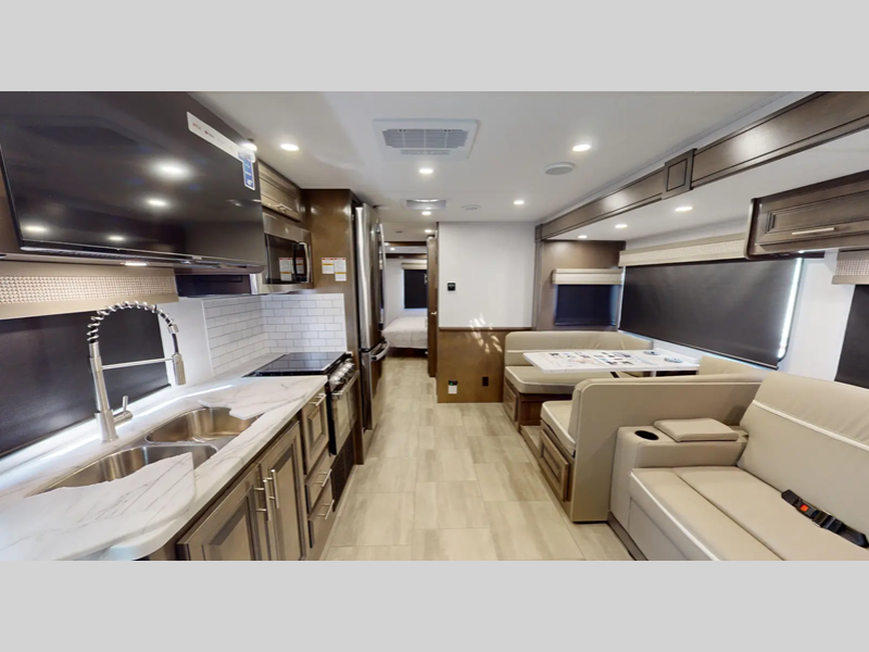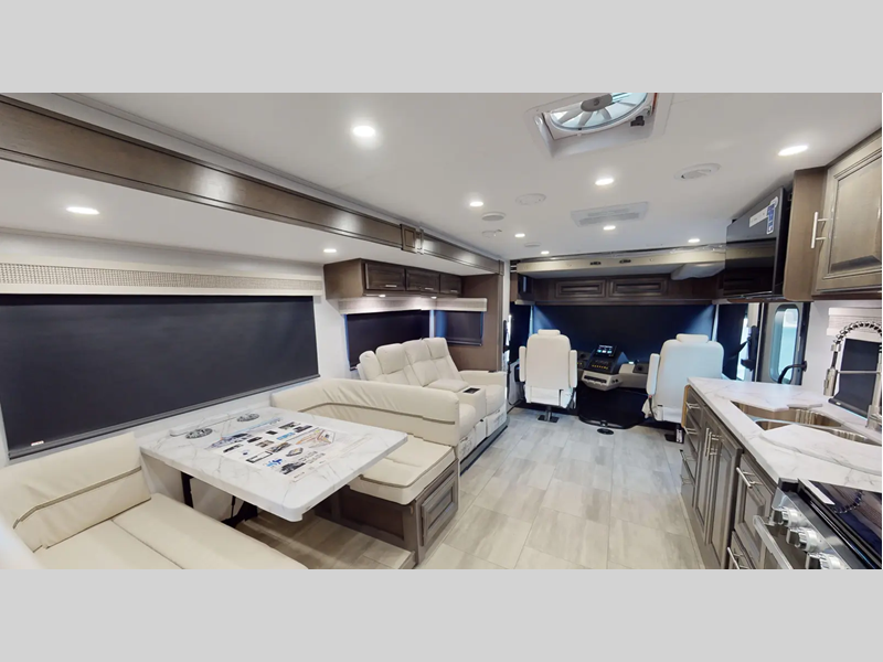 You will love the features that come standard on each model, like the hydraulic 4-point leveling system, color side and rear cameras, thermal foil kitchen countertops, and an LED TV in the living room to name a few. The durable construction includes a one-piece fiberglass roof, aluminum framed vacuum bonded floors, and high density block foam insulation so you can enjoy your coach for years to come. And we haven't even mentioned the exterior conveniences; a solar panel with a controller, a power awning with LED lights, an outside entertainment center, and more!