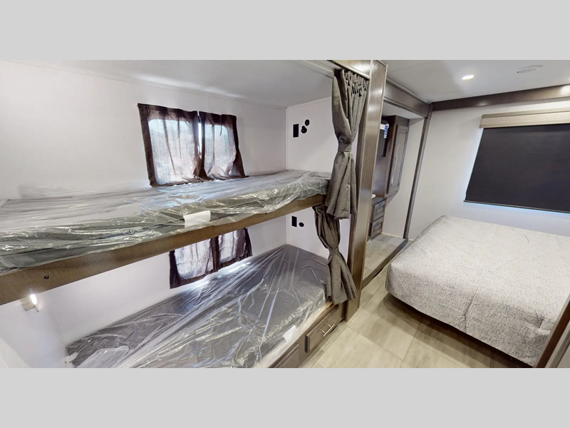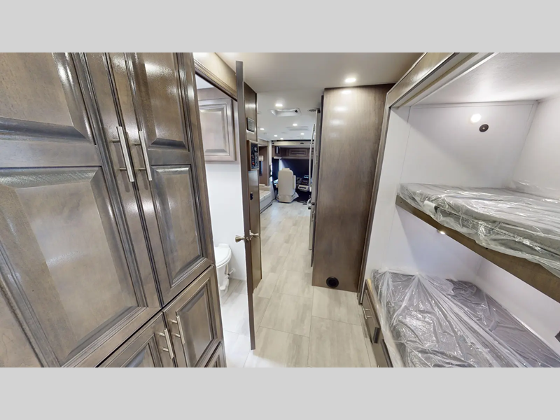 Sleeps 8 Slides 2 Length 34 ft 6 in Ext Width 8 ft 4 in Ext Height 12 ft 9 in Int Height 6 ft 10 in Hitch Weight 5000 lbs GVWR 22000 lbs Fresh Water Capacity 50 gals Grey Water Capacity 42 gals Black Water Capacity 42 gals Furnace BTU 35000 btu Generator 6,000 Watt Yamaha Fuel Type Gasoline Engine 7.3L V8 Chassis Ford F53 Horsepower 350 hp Fuel Capacity 80 gals Wheelbase 228 in Number Of Bunks 3 Available Beds King Torque 468 ft-lb Refrigerator Type Stainless Steel Residential Refrigerator Size 17 cu ft Cooktop Burners 3 Number of Awnings 1 Axle Weight Front 8000 lbs Axle Weight Rear 15000 lbs LP Tank Capacity 10.3 gal Water Heater Capacity 6 gal AC BTU 26000 btu TV Info LR 40" LED TV, BR 32" LED TV, Ext. 32" LED TV Awning Info 12' Power Patio Awning w/LED Light Gross Combined Weight 26000 lbs Shower Type Standard Electrical Service 50 amp Similar Floorplans