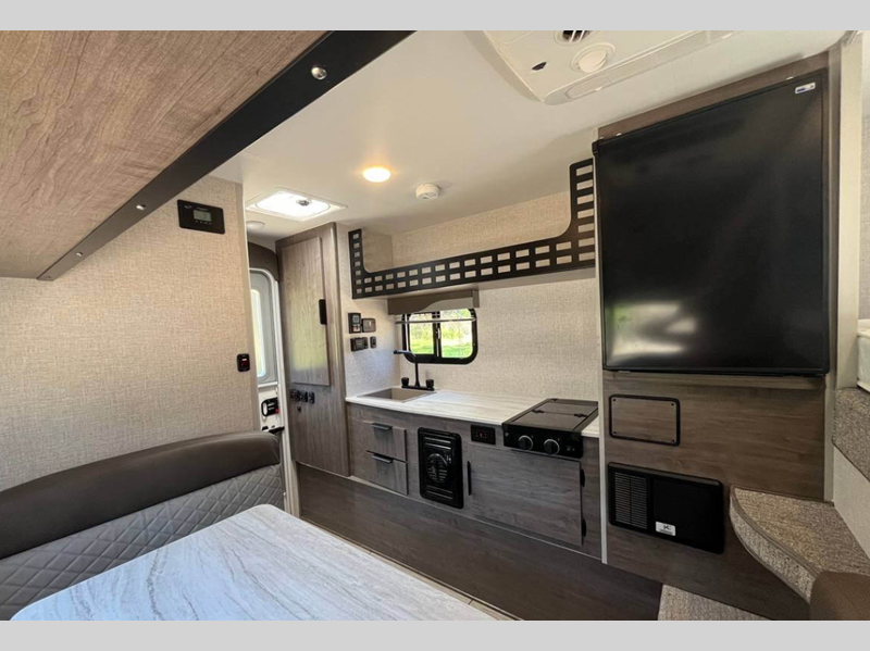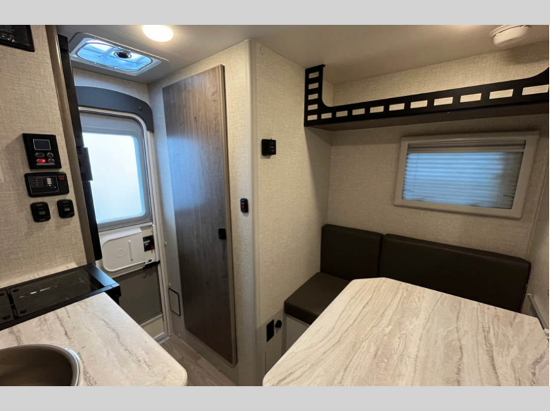 Each camper features Azdel interior walls, a one-piece roof, and block foam insulation throughout to help extend your camping season. The overhead Molle panel storage space will let you pack essentials out of the way, and the 12V/USB charging ports will keep your electronics powered up. Outside, you'll find LED lights, a swing-out entry assist handle, Keyed-Alike doors, and an exterior wash station to wash off hiking gear.