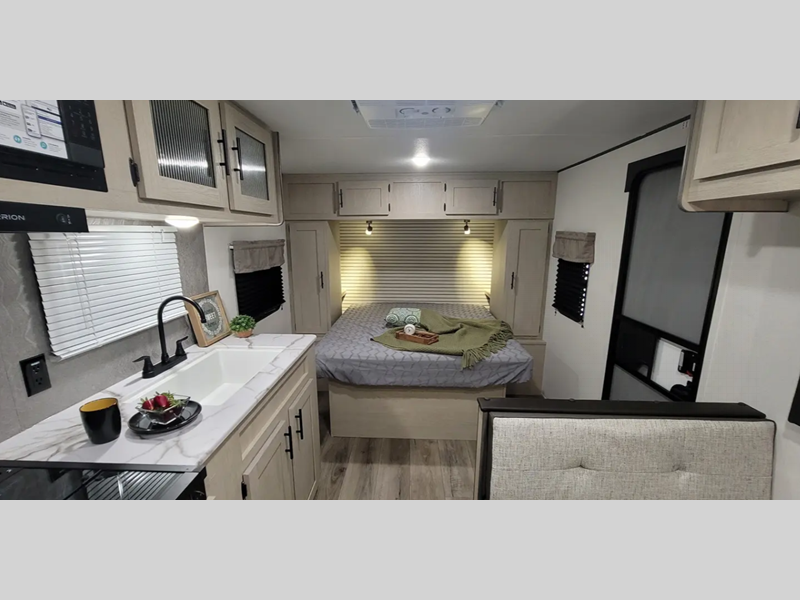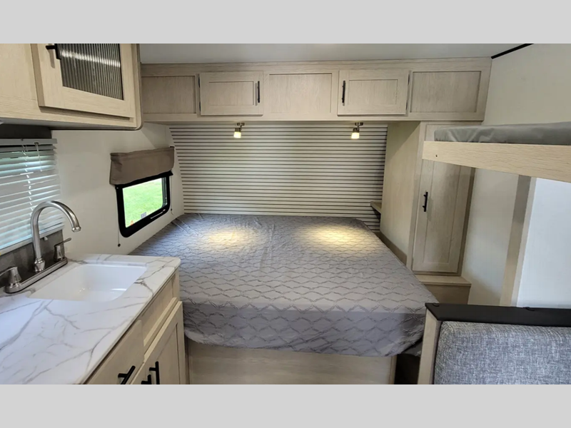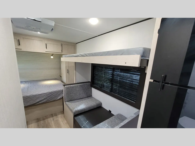 Sleeps 7 Length 22 ft 9 in Ext Width 8 ft Ext Height 10 ft 1 in Hitch Weight 538 lbs GVWR 4938 lbs Dry Weight 3730 lbs Cargo Capacity 1208 lbs Fresh Water Capacity 39 gals Grey Water Capacity 30 gals Black Water Capacity 30 gals Number Of Bunks 2 Available Beds RV Queen Refrigerator Type Residential Style Refrigerator Size 8 cu ft Cooktop Burners 2 Shower Size 24" x 40" LP Tank Capacity 1 Water Heater Type Tankless AC BTU 8000 btu Awning Info 20 lbs Axle Count 1 Shower Type Tub/Shower Combo Similar Floorplans