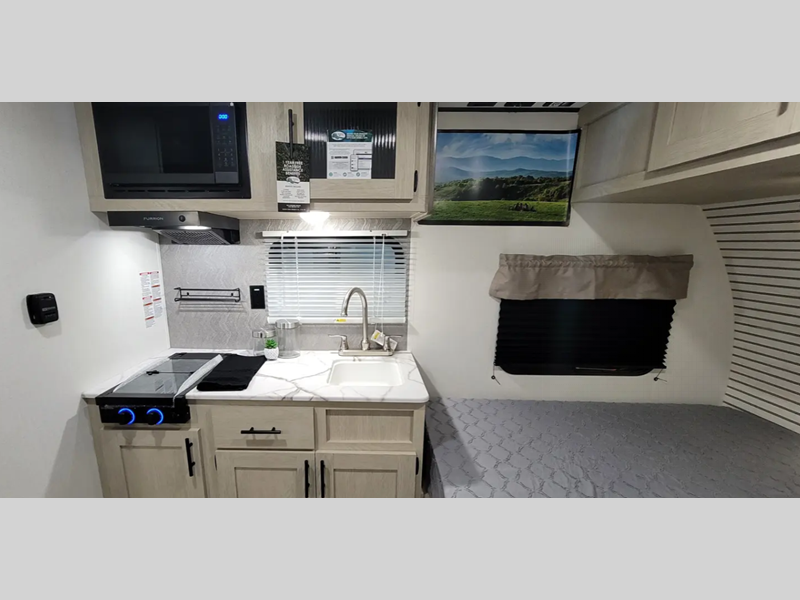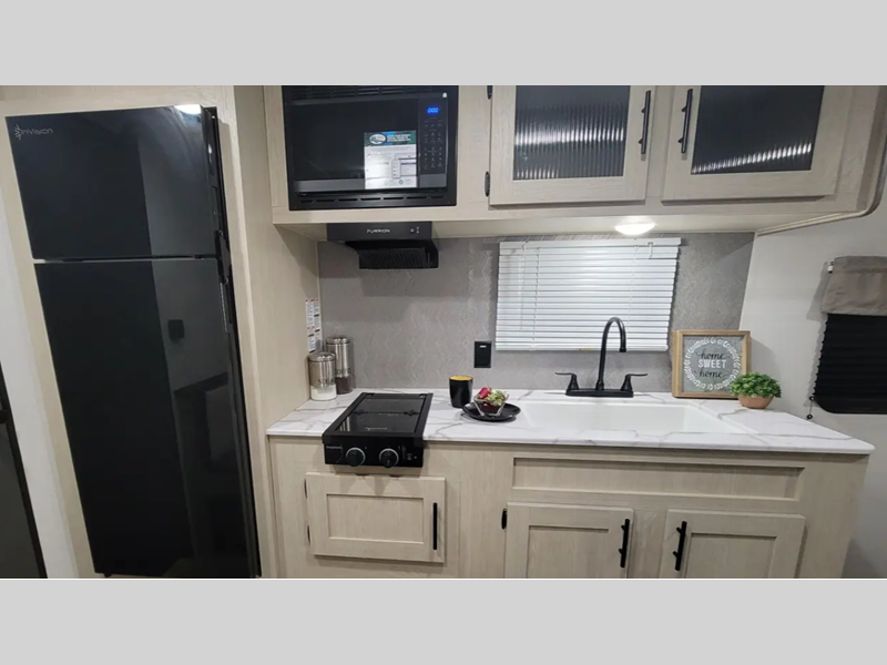 Sleeps 3 Length 23 ft 1 in Ext Width 8 ft Ext Height 10 ft 6 in Hitch Weight 397 lbs GVWR 4797 lbs Dry Weight 3689 lbs Cargo Capacity 1108 lbs Fresh Water Capacity 39 gals Grey Water Capacity 30 gals Black Water Capacity 30 gals Available Beds RV Queen Refrigerator Type Residential Style Refrigerator Size 8 cu ft Cooktop Burners 2 Shower Size 24" x 40" LP Tank Capacity 1 Water Heater Type Tankless AC BTU 8000 btu Awning Info 20 lbs Axle Count 1 Shower Type Standard Similar Floorplans