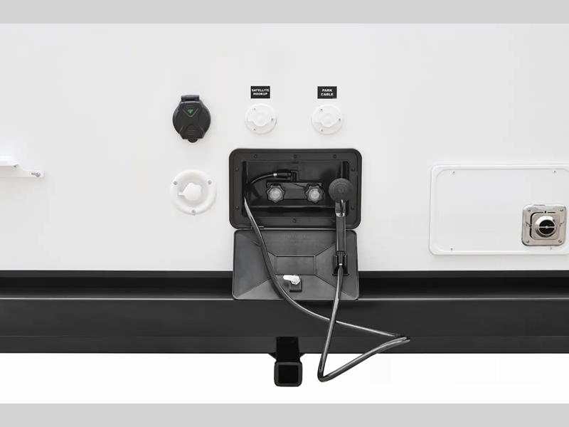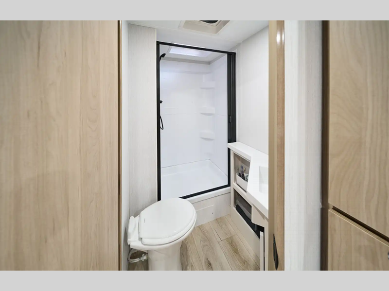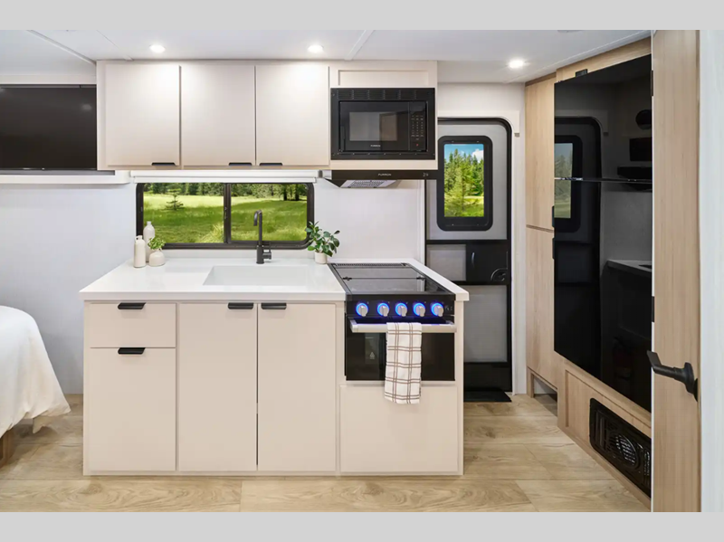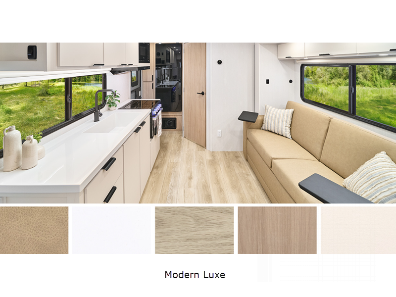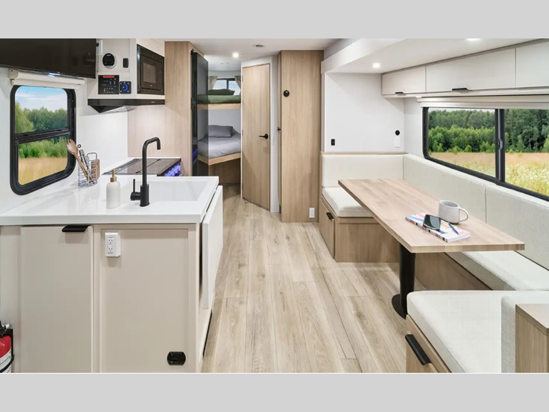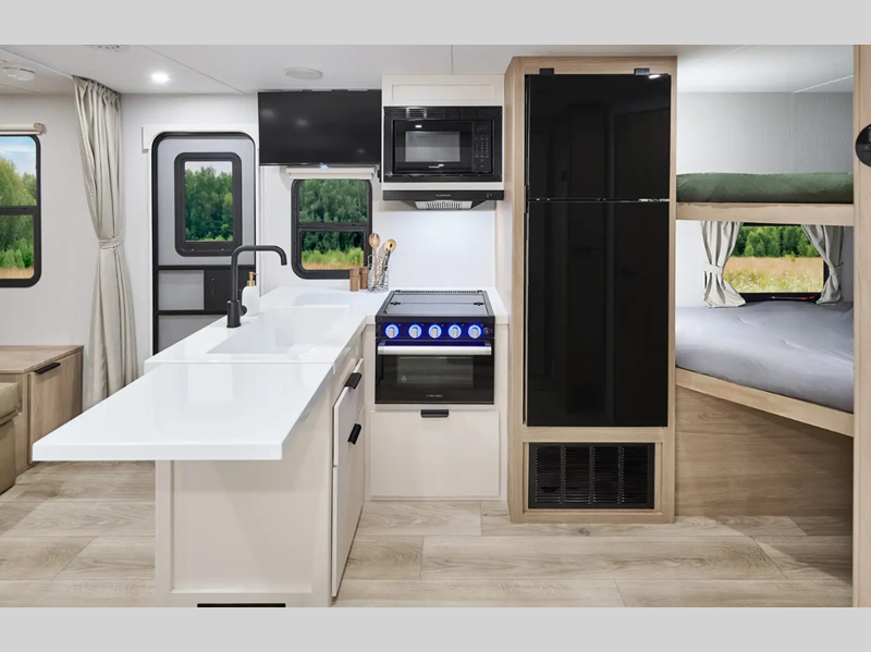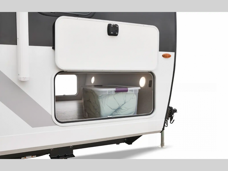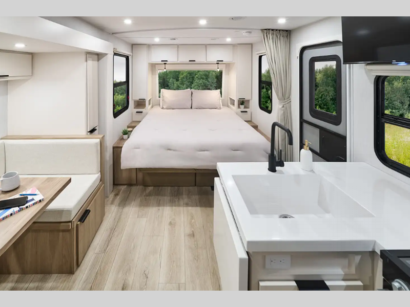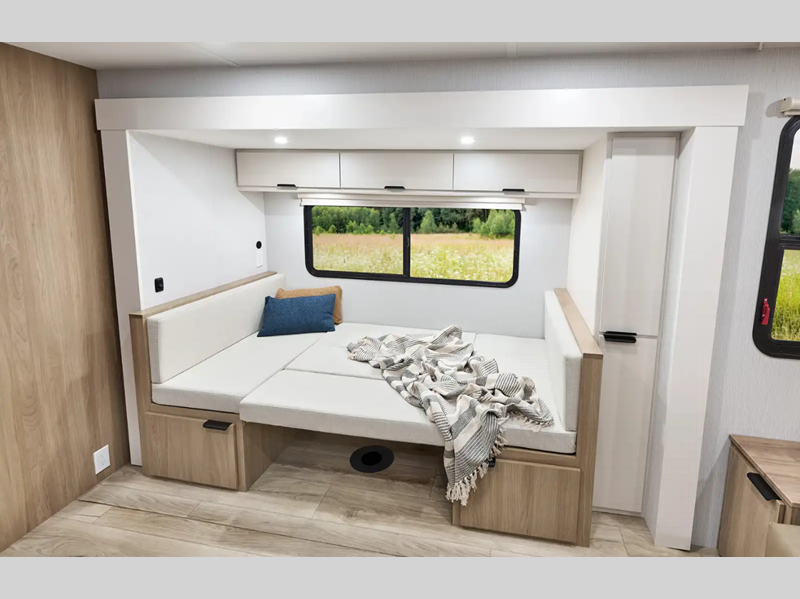 Each Thrive is built with an NXG engineered frame, fiberglass sidewalls with Azdel and a one-piece TPO roof membrane for added durability. There is a power tongue jack and power stabilizer jacks outside for hassle-free set up, and the 200-watt solar panel will provide some off-grid capabilities. Inside, there are many comforts of home including roller shades, residential recessed ceiling lights, versatile sleeping arrangements and more!